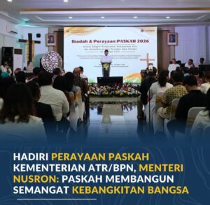 Menteri Agraria dan Tata Ruang/Kepala Badan Pertanahan Nasional (ATR/BPN), Nusron Wahid, menghadiri Perayaan dan Ibadah Paskah Persekutuan Umat Kristiani Kementerian ATR/BPN pada (25/04/2026).
