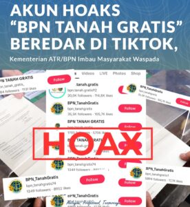 Belakangan beredar informasi di platform TikTok mengenai akun yang menyebarluaskan hoaks “BPN Tanah Gratis” Jakarta, kamis (21/08).